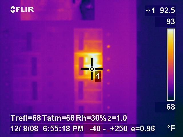 ![]() Thermal Imaging | This final thermogram shows a service panel in a home. One breaker is notably warmer than adjacent breakers of similar amp rating and load . An IR survey can help locate problems before they become a costly repair item. |
