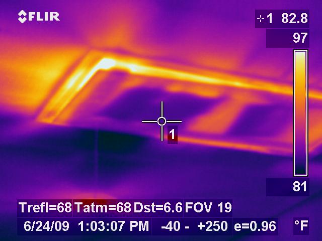 In this first photo (thermogram) you can see very clearly the effect of missing attic insulation following the installation of a new HVAC unit. The insulation next to the air handler of the return duct system was not replaced and the heat signature stands out. This was costing the unaware homeowner money. When shown this photo the homeowner immediately went up into the attic. He found the missing insulation nearby, where it had been tossed aside during the HVAC work, and was able to reinstall it himself.
